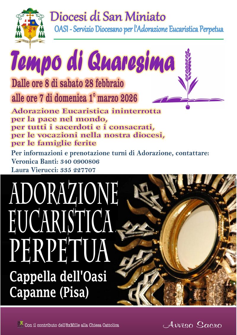 L’iniziativa, in programma dalle 8 di sabato 28 febbraio alle 7 di domenica 1° marzo, si svolgerà nella cappella dell’Oasi di Capanne e offrirà ai fedeli la possibilità di vivere un’adorazione eucaristica ininterrotta. L’evento di preghiera si concentrerà su intenzioni di preghiera universali e fortemente attuali: la pace nel mondo, il sostegno a tutti i sacerdoti e i consacrati, la preghiera per le vocazioni nella Chiesa locale e la vicinanza alle famiglie ferite. In un’epoca segnata da conflitti e tensioni, l’adorazione eucaristica per la pace assume un significato potente. Mentre le bombe fanno rumore e le esplosioni urlano l’odio, la pace è questione di silenzio. Per questo serve qualcosa di più profondo delle parole urlate e questo è il tempo del silenzio che si fa preghiera. L’adorazione diventa un’umile e potente richiesta di irruzione del Regno escatologico nell’attuale ordine mondano, una pace che ha necessarie e precise implicazioni sociali, chiamando ogni credente ad aprirsi al servizio e alla carità.