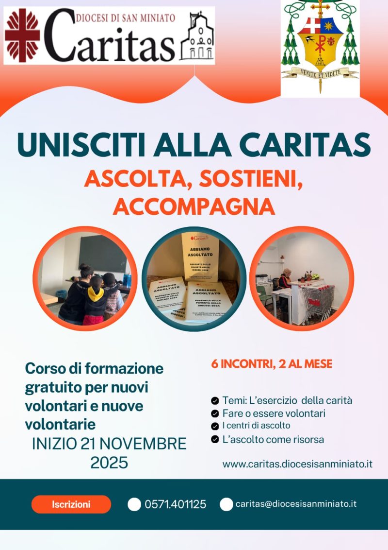 Prende il via il prossimo 21 novembre il corso di formazione destinato ai nuovi volontari Caritas della Diocesi di San Miniato. L’iniziativa, intitolata «Unisciti alla Caritas. Ascolta, sostieni, accompagna», rappresenta un’importante occasione per tutti coloro che desiderano impegnarsi concretamente a sostegno delle persone più bisognose che si rivolgono ai Centri di ascolto diocesani e parrocchiali. Il percorso formativo è stato pensato non solo per chi si avvicina per la prima volta al mondo della Caritas, ma anche per chi è entrato da poco a far parte dell’organizzazione e sente il bisogno di approfondire la realtà in cui opera, oltre che per quei volontari che, pur svolgendo già qualche servizio, non hanno mai avuto l’opportunità di partecipare a un corso di formazione promosso dalla Caritas diocesana.