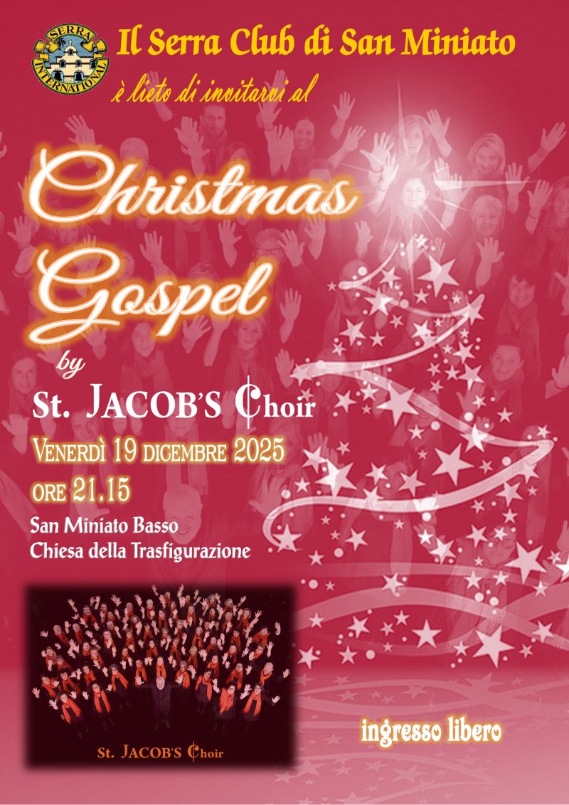 Il Serra Club di San Miniato ha organizzato per Venerdì 19 dicembre p.v. una serata “Christmas Gospel”, per accompagnarci nel clima di gioiosa attesa del Natale. L’evento si terrà a San Miniato Basso, nella chiesa della Trasfigurazione (via Tosco Romagnola Est, 520), alle ore 21.15.
