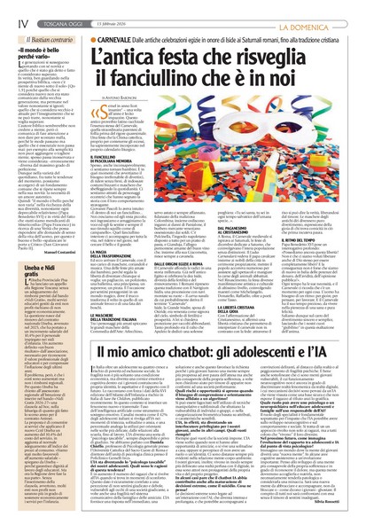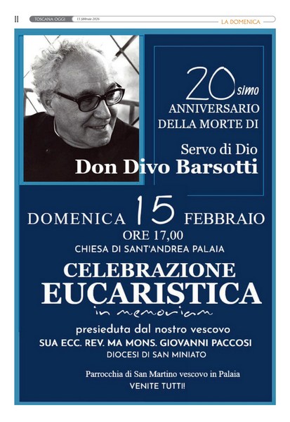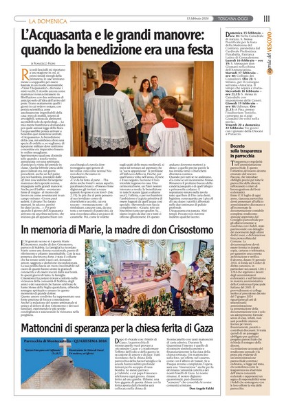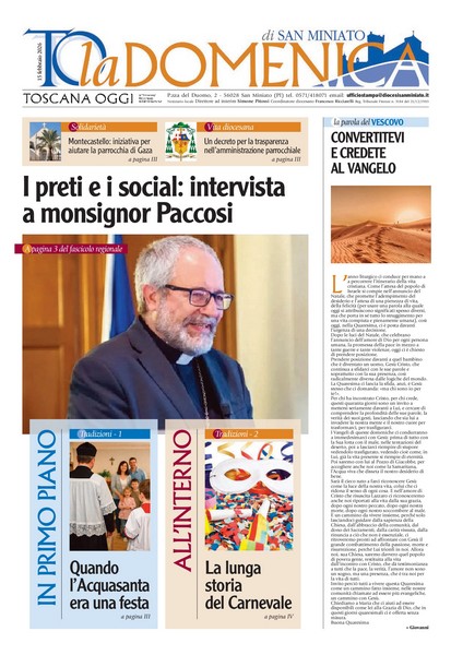 Il numero di questa settimana: Abbonamenti al settimanale diocesano Abbonamento a Toscana Oggi (cartaceo o digitale): Abbonamento Annuale Cartaceo - ToscanaOggi Abbonamento Annuale Digitale - ToscanaOggi Numeri archiviati più recenti ... La Domenica del 18 Gennaio 2026 La Domenica del 11 Gennaio 2026 La Domenica del 4 Gennaio 2026 La Domenica del 21 Dicembre 2025 La Domenica del 14 Dicembre 2025 Archivio “La Domenica” per anno 2026202520242023202220212020201920182017
