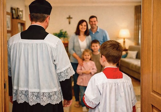 «C’è da far festa al prete… l’ha detto anche Gesù!»: senza saperlo, parafrasava Marco: «Possono forse digiunare gli invitati a nozze quando lo sposo è con loro?» (Mc 2,19). Io più che al prete pensavo al suo invidiato corteo di chierichetti e accoliti, cui era toccato – sventurata sorte – di rimbalzare, casa per casa, da una torta a un vassoio di pasticcini, da una cioccolata calda a un pacco di caramelle. Poi, come le vedette sugli spalti delle mura medievali, si stava sul terrazzo ad aspettare che la “sacra apparizione” si profilasse all’imbocco della via. Finché, per quell’unica volta nell’anno, il prete e il suo seguito, facevano il loro trionfale ingresso in casa. Una cerimonia breve, un Pater nostrer intonato a modo, la benedizione in tutte le stanze (guai a saltarne una!), l’offerta, e per noi bambini l’ambizione e la gioia primitiva di essere bagnati da quell’acqua così speciale. «Reverendo non faccia complimenti». «Grazie, solo un biscottino tanto per gradire. Sa… siamo in giro da due ore e tutti ci offrono ghiottonerie. Di questo andazzo dovremo metterci a dieta»: a quelle precise parole la tua invidia verso i chierichetti diventava cosmica. Quando poi tutti se ne andavano, era come se un incantesimo finisse. Rimaneva il profumo buono della candela pasquale e di quell’allegro e primaverile codazzo. E soprattutto restava sulla tavola tutto quel ben di Dio caria-denti, legittima contropartita per i piccoli di casa dopo i sacrifici affrontati nelle due settimane di pulizie profonde. L’Acquasanta era passata. Altri tempi. Peccato non riaverne indietro qualche lacerto.