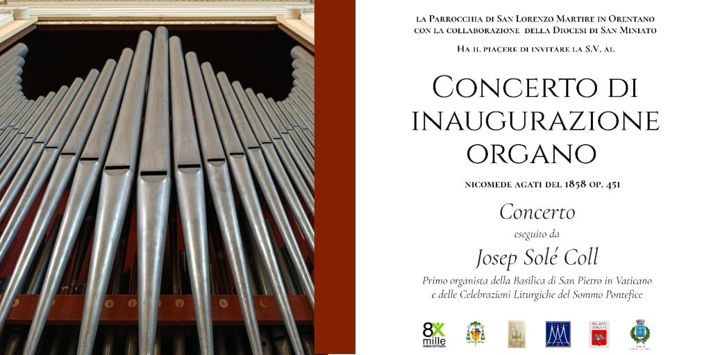 Per celebrare questo importante traguardo la Domenica 9 Novembre alle ore 18.30 di terrà il Concerto di inaugurazione tenuto da M° Josep Solé Coll, primo organista della Basilica di San Pietro in Vaticano e delle Celebrazioni Liturgiche del Sommo Pontefice. Il popolo Orentanese da sempre legato alla città di Roma non poteva avere un dono più significativo di questo, l’organista del Papa a inaugurare il proprio organo tornato agli antichi splendori.