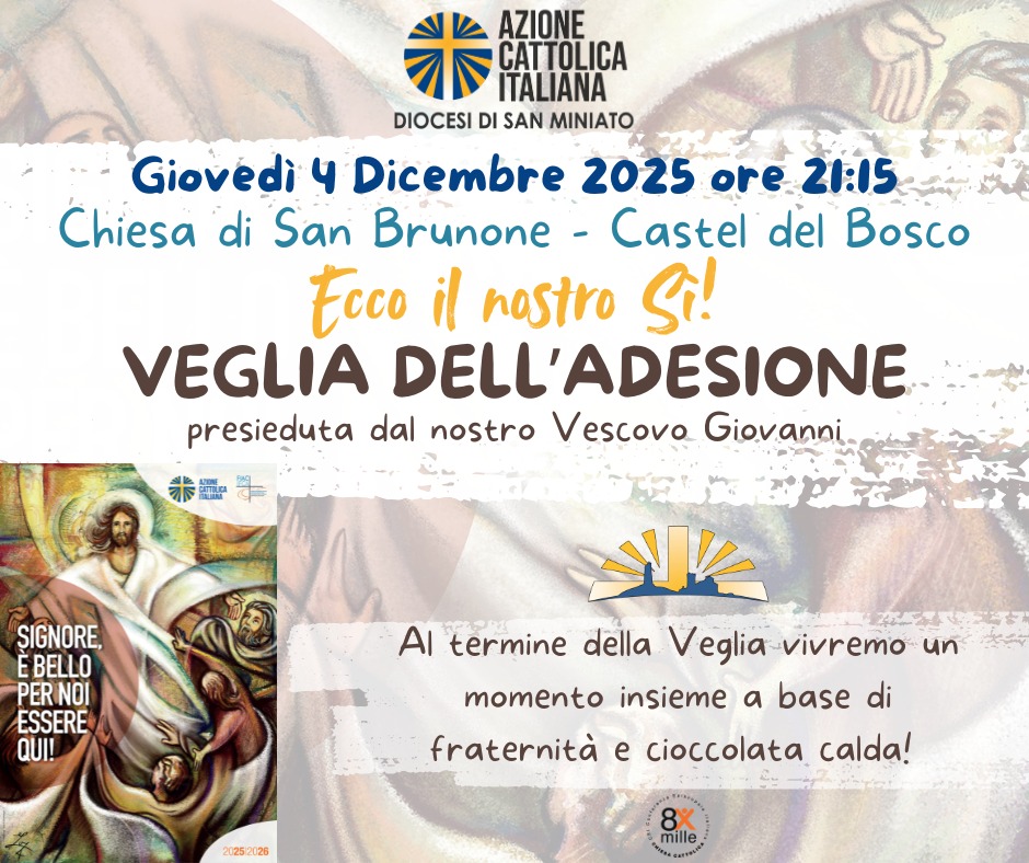 Appuntamenti e segnalazioni AC: Veglia dell’Adesione giovedì 4 Dicembre Descrizione: Inizio: 04/12/2025 21:15 Fine: 04/12/2025 23:00 Categorie: Appuntamenti e segnalazioni Città: San Miniato Regione: Toscana Paese: Italia