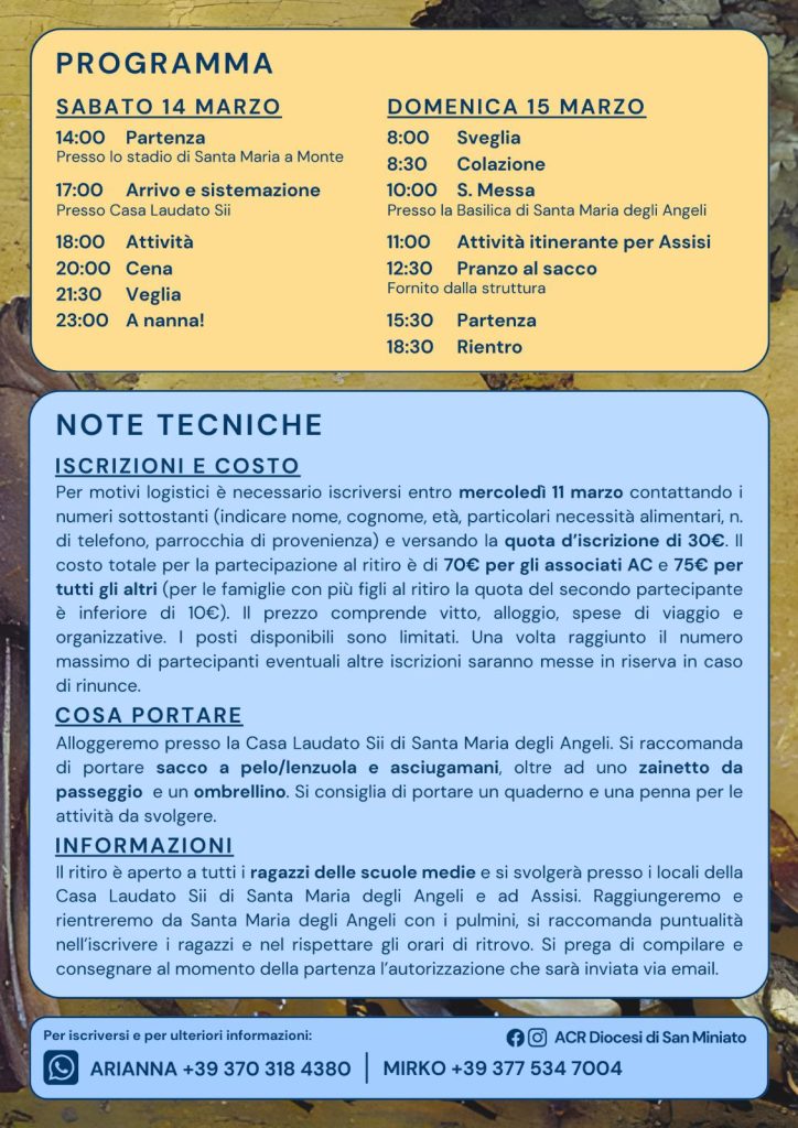 Appuntamenti e segnalazioni ACR Ritiro di Quaresima sabato 14 Marzo Descrizione: Inizio: 14/03/2026 14:00 Fine: 15/03/2026 19:00 Categorie: Appuntamenti e segnalazioni Città: San Miniato Regione: Toscana Paese: Italia