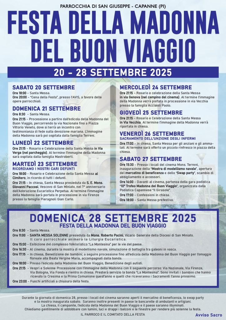 Appuntamenti e segnalazioni Festa della Madonna del Buon Viaggio domenica 28 Settembre Descrizione: Inizio: 28/09/2025 08:30 Fine: 28/09/2025 23:30 Categorie: Appuntamenti e segnalazioni Città: San Miniato Regione: Toscana Paese: Italia