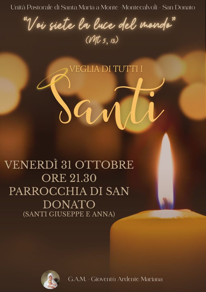 Appuntamenti e segnalazioni GAM: Veglia di Tutti i Santi venerdì 31 Ottobre Descrizione: Inizio: 31/10/2025 21:30 Fine: 31/10/2025 23:00 Categorie: Appuntamenti e segnalazioni Città: San Miniato Regione: Toscana Paese: Italia