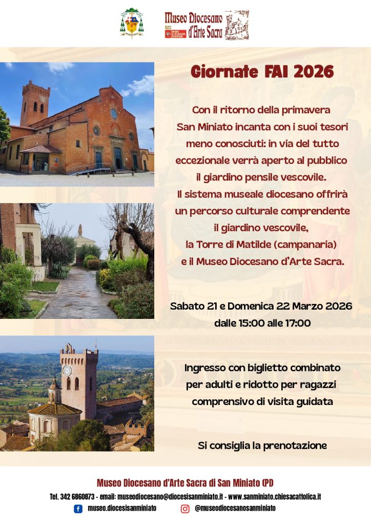 Con il ritorno della primavera Sabato 21 e domenica 22 marzo 2026 tornano, per la 34ª edizione, le “Giornate FAI di Primavera”, il grande evento di piazza attraverso il quale, dal 1993, il FAI dà la possibilità di riscoprire il patrimonio culturale e paesaggistico delle città e dei territori in cui si vive. In tale occasione saranno visitabili centinaia di luoghi, spesso poco conosciuti e valorizzati, molti dei quali solitamente inaccessibili. Proprio seguendo tale criterio, il Museo Diocesano d’Arte Sacra di San Miniato (Pi) proporrà la straordinaria apertura del giardino vescovile.