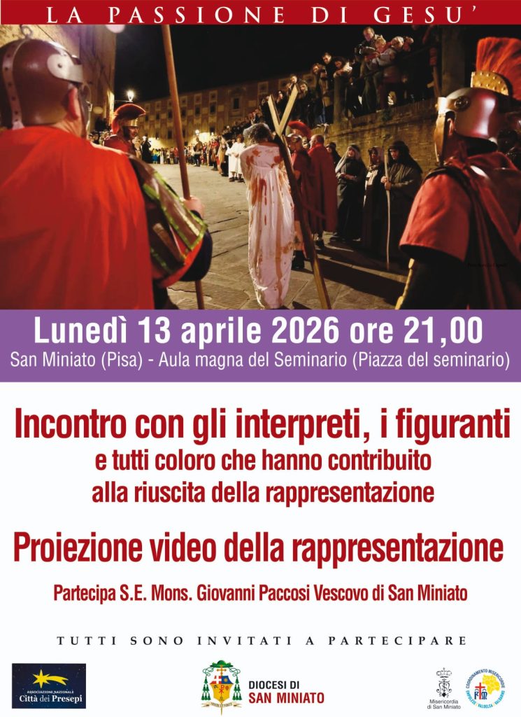 Agenda del Vescovo, Appuntamenti e segnalazioni Incontro con i figuranti de “La Passione di Gesù” lunedì 13 Aprile Descrizione: Inizio: 13/04/2026 21:00 Fine: 13/04/2026 23:00 Categorie: Agenda del Vescovo, Appuntamenti e segnalazioni Città: San Miniato Regione: Toscana Paese: Italia