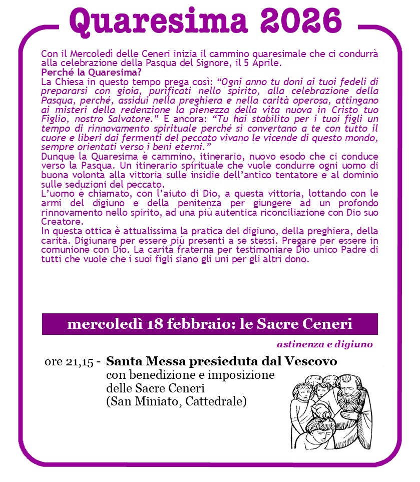 Agenda del Vescovo, Appuntamenti e segnalazioni Mercoledì delle Ceneri mercoledì 18 Febbraio Descrizione: Inizio: 18/02/2026 21:15 Fine: 18/02/2026 22:15 Categorie: Agenda del Vescovo, Appuntamenti e segnalazioni Città: San Miniato Regione: Toscana Paese: Italia