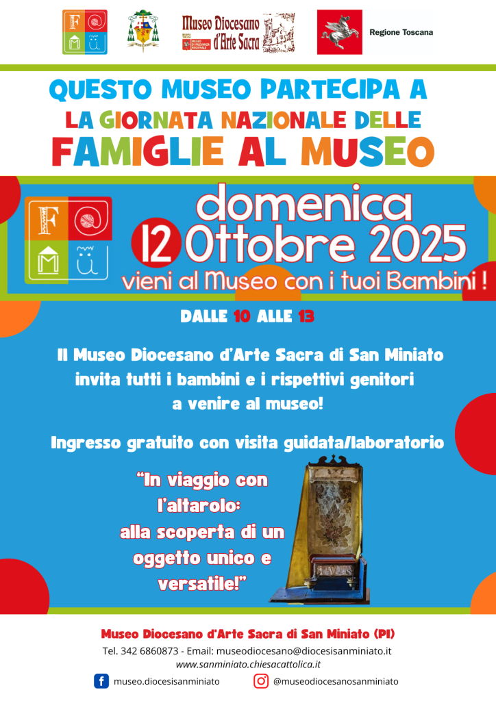 In occasione dell’edizione 2025 di F@mu, iniziativa destinata ai bambini e alle rispettive famiglie, il Museo Diocesano d’Arte Sacra aprirà i suoi battenti a titolo gratuito a tutti coloro che vorranno partecipare. Verrà organizzata una mattinata ludica accompagnata da proiezione di filmati, narrazione di storie e disegni, durante la quale verrà presentato un oggetto insolito e originale: l’altarolo (altare portatile di piccole dimensioni). Tale manufatto, di cui è conservato un esemplare nel nostro museo e compagno di viaggio di alcuni dei nostri antenati, sarà il protagonista assoluto dell’evento.