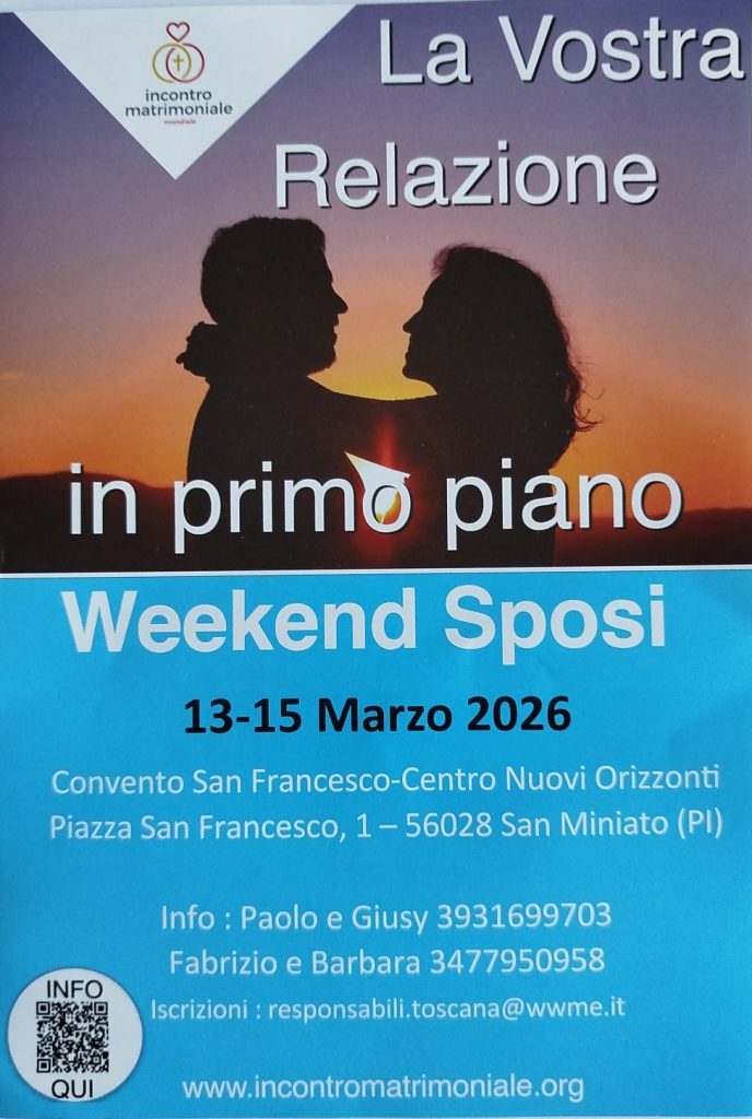 Appuntamenti e segnalazioni Nuovi Orizzonti: “Weekend Sposi” venerdì 13 Marzo Descrizione: Inizio: 13/03/2026 17:00 Fine: 15/03/2026 17:00 Categorie: Appuntamenti e segnalazioni Città: San Miniato Regione: Toscana Paese: Italia