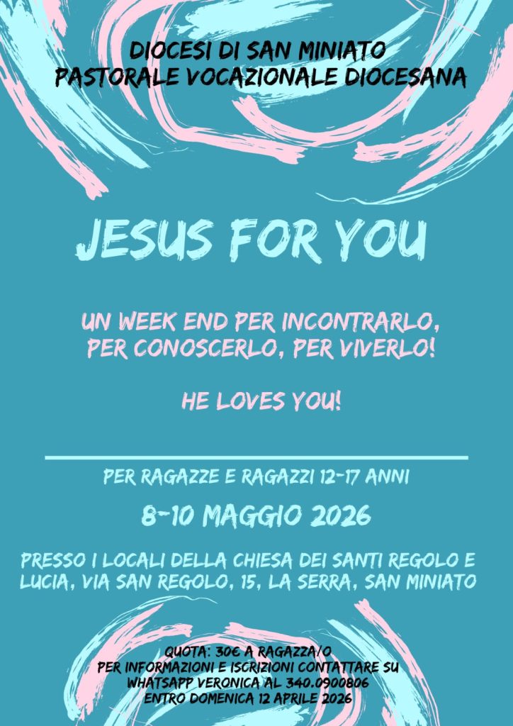 Appuntamenti e segnalazioni Pastorale Vocazionale: “Jesus for you” venerdì 8 Maggio Descrizione: Inizio: 08/05/2026 17:00 Fine: 10/05/2026 18:00 Categorie: Appuntamenti e segnalazioni Città: San Miniato Regione: Toscana Paese: Italia