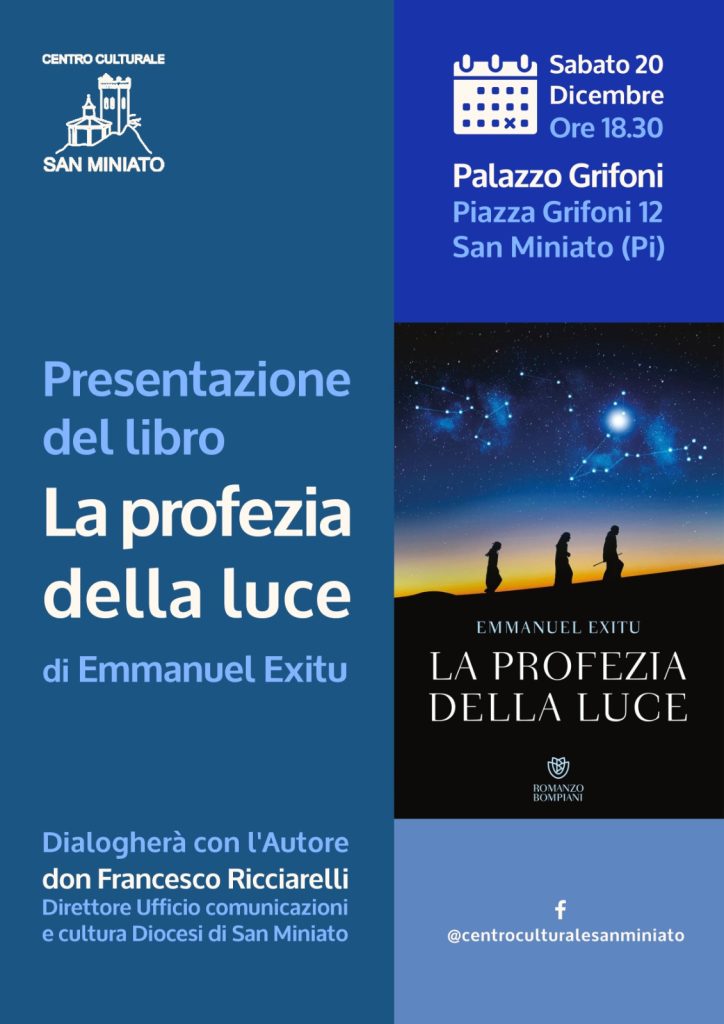 Appuntamenti e segnalazioni Presentazione del libro “La profezia della luce” sabato 20 Dicembre Descrizione: Inizio: 20/12/2025 18:30 Fine: 20/12/2025 20:00 Categorie: Appuntamenti e segnalazioni Città: San Miniato Regione: Toscana Paese: Italia