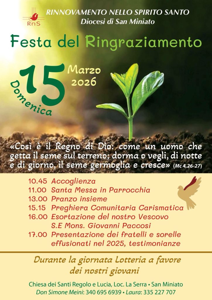 Appuntamenti e segnalazioni RnS: Festa del Ringraziamento domenica 15 Marzo Descrizione: Inizio: 15/03/2026 10:45 Fine: 15/03/2026 18:00 Categorie: Appuntamenti e segnalazioni Città: San Miniato Regione: Toscana Paese: Italia