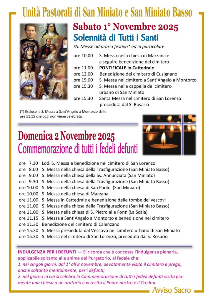 Agenda del Vescovo, Appuntamenti e segnalazioni San Miniato: Festa di Tutti i Santi sabato 1 Novembre Descrizione: Inizio: 01/11/2025 11:00 Fine: 01/11/2025 12:00 Categorie: Agenda del Vescovo, Appuntamenti e segnalazioni Città: San Miniato Regione: Toscana Paese: Italia