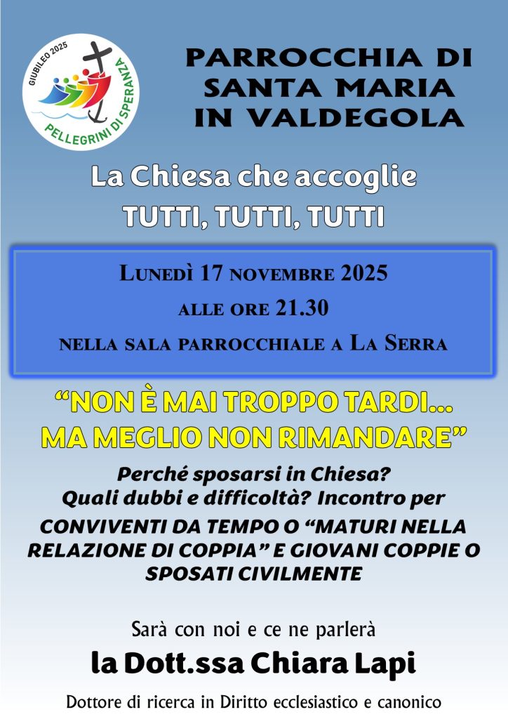 Appuntamenti e segnalazioni Valdegola: “Perchè sposarsi in chiesa” lunedì 17 Novembre Descrizione: Inizio: 17/11/2025 21:30 Fine: 17/11/2025 23:00 Categorie: Appuntamenti e segnalazioni Città: San Miniato Regione: Toscana Paese: Italia