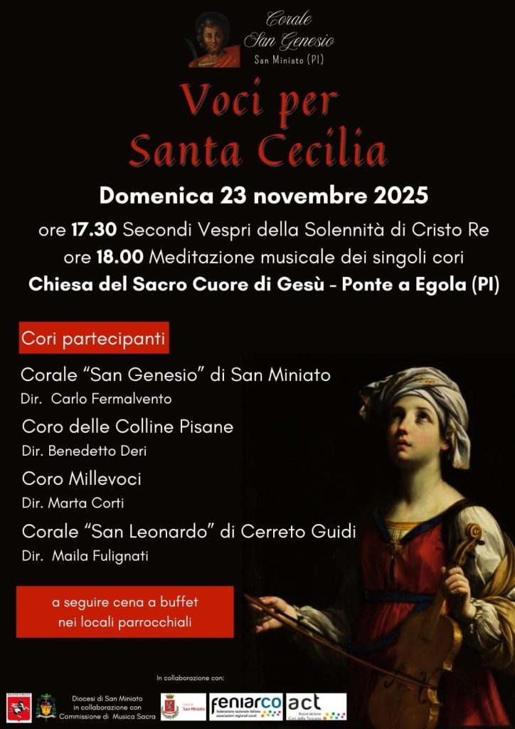 Nel pomeriggio di Domenica 23 Novembre, nella Chiesa Propositura del Sacro Cuore in Ponte a Egola (Pi), la Corale “San Genesio” insieme ad altri cori collaboratori aderisce anche quest’anno all’evento nazionale organizzato da FENIARCO “Voci per Santa Cecilia” per festeggiare la celeste patrona della musica e di tutti coloro che si fanno interpreti dell’arte sonora. Alle 17.30 saranno celebrati i Vespri della Solennità di Cristo Re dell’universo e a seguire una meditazione musicale dei singoli cori. Per questa occasione i cori ospiti saranno: Coro polifonico delle Colline Pisane, Coro Millevoci, Corale San Leonardo di Cerreto Guidi.